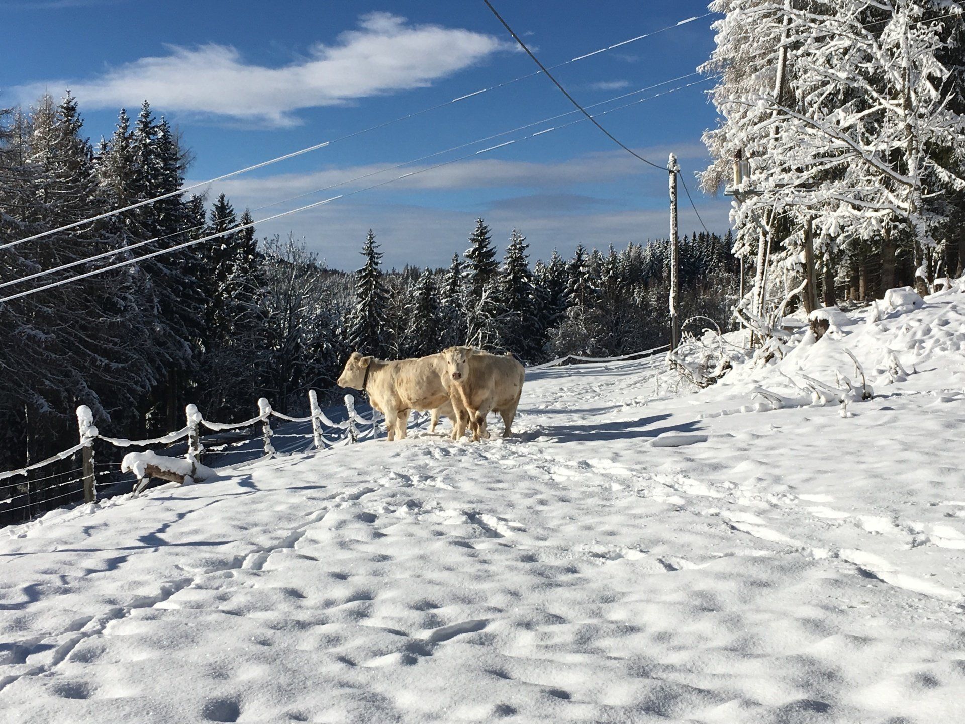 Eine Besonderheit bei uns am Hof ist, dass die Kühe im Winter in einem Offenstall untergebracht sind und sich jeden Tag und bei jedem Wetter auf ihrer Winterweide mit Wald vergnügen dürfen.